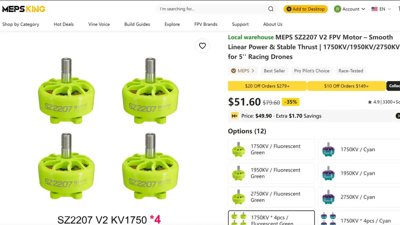 | Motors | MEPS SZ2207 V2 FPV Motor | $51.60 | MEPSKING | increased burst power. Improved internal design enhanced crash resistance, making it more durable New anti-slip design secures props firmly. | 6s / measures: ⌀28.93mmx31.5mm / Weight: 34g |