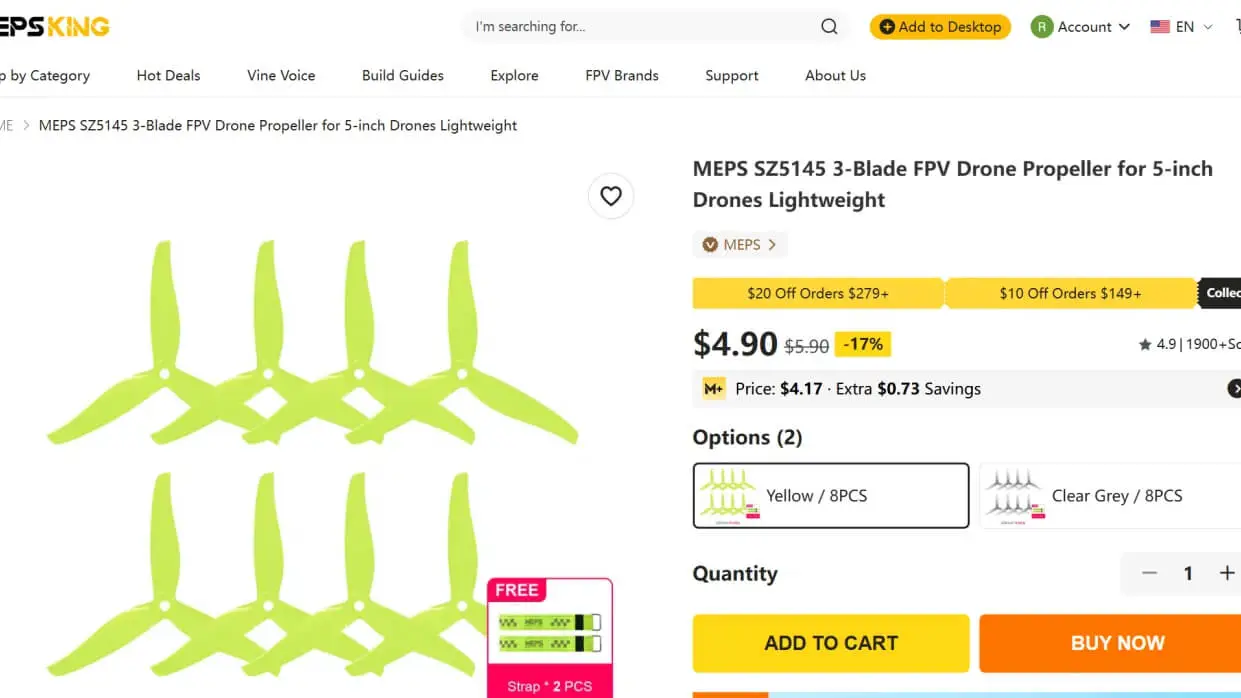 | Propellers | MEPS SZ5145 3-Blade FPV Drone Propeller | $4.9(8PCS) | MEPSKING | Special blade design provides greater thrust.Selected PC material for greater durabilityLarger pitch for higher speed.Perfect for 5″ FPV freestyle drones and racing drones. | Diameter: 5.3Pitch: 4.5Blade count: 3 |