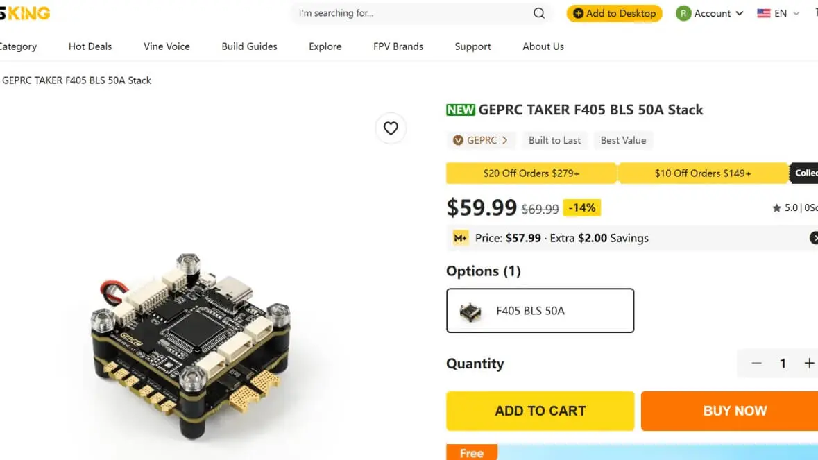 | Stack | GEPRC TAKER F405 BLS 50A Stack | $59.99 | MEPSKING | stable, responsive flight controlsimple installation, smooth throttle response powerful motor output | 2-6S / Blheli_S / IMU: ICM42688-P(SPI) / uart 6 / Weight: 7.7g |