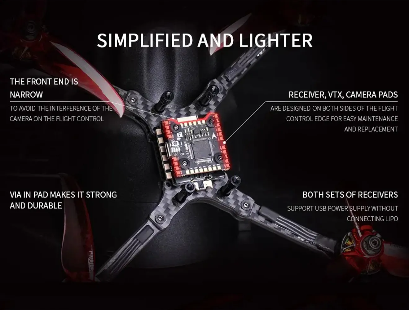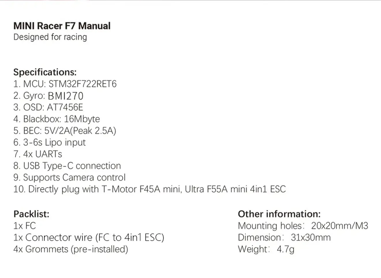 The T-HOBBY Mini Racer F7 20x20 Flight Controller delivers elite performance for compact 3-5 inch micro racing drones, agile tiny whoops, and lightweight freestyle builds. Powered by an STM32F722 processor and MPU6000 gyro, it offers precise control for high-speed FPV racing and technical acro flying. Features like 3-6S support, a 16MB blackbox, and USB-C connectivity make it the ideal choice for competitive pilots and cinewhoop enthusiasts seeking a robust, space-saving flight controller.