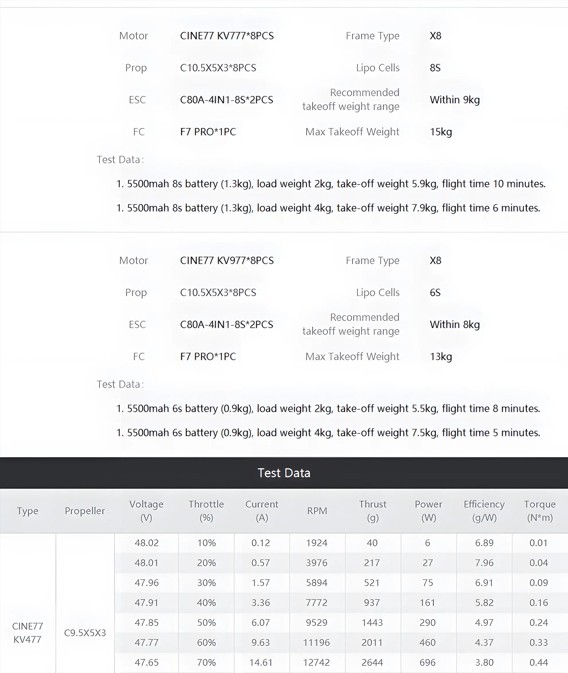 It provides more than 7 minutes of flight time with a 2.5kg load on 6s, 8s, or 12s batteries.