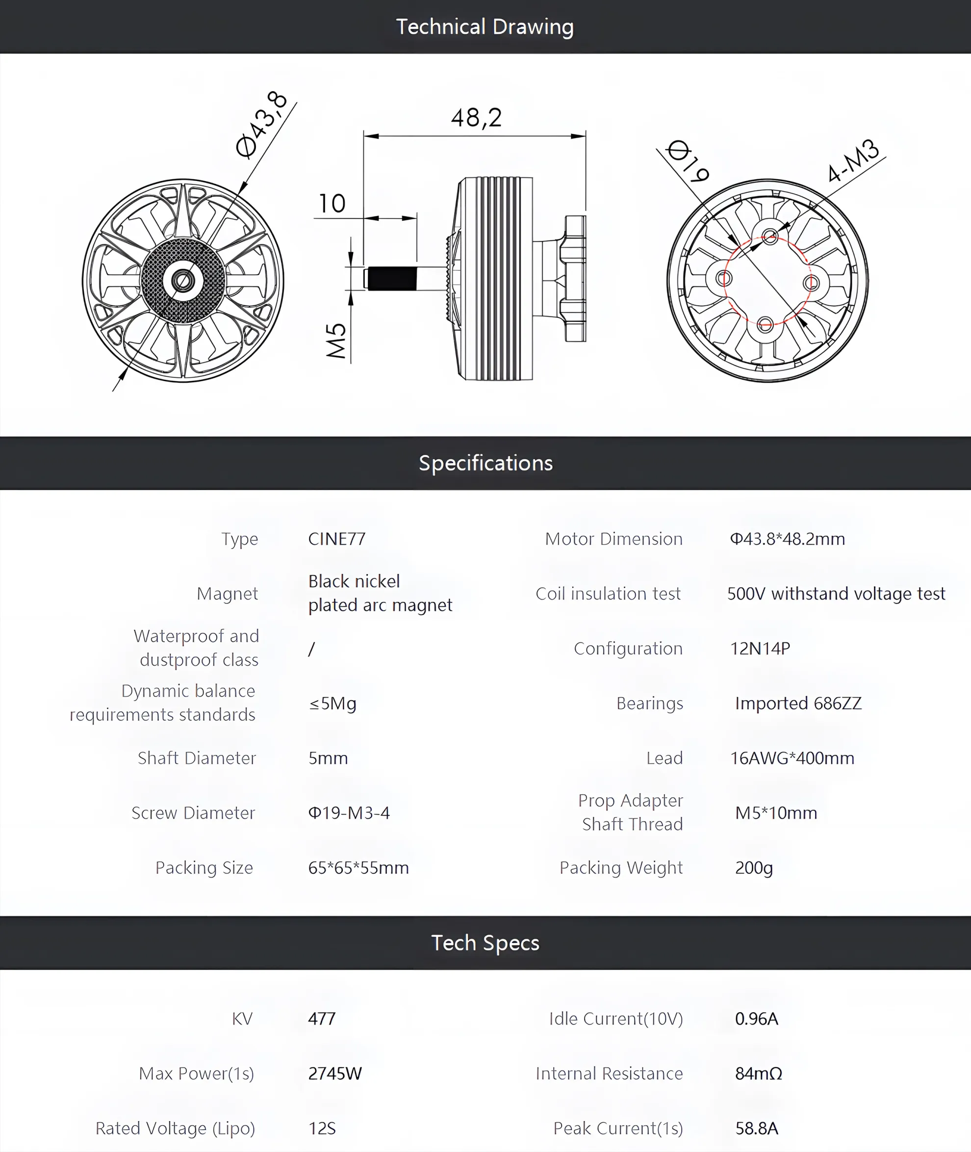 The T-Hobby Cine77 3610 Motor is a high-performance solution for cinematic drones, delivering exceptional thrust and smooth control for professional aerial filming. Its high efficiency and torque allow for precise maneuvering and extended flight times, even under heavy loads. Built for reliability, the Cine77 handles high-throttle and long-duration flights with excellent heat dissipation and durability. Combined with the C80A 8s 4-in-1 ESC, it ensures steady and worry-free cinematic flight, making it ideal for filmmakers and drone enthusiasts seeking top-tier performance.
