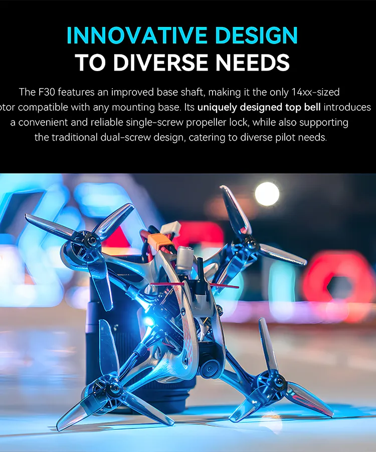 The T-HOBBY F30 1404 Motor is a high-performance brushless motor designed for 3-inch FPV drones. Delivering over 300g of powerful thrust per motor, it offers incredibly responsive and precise control for competitive racing and agile freestyle flying. Its durable design with PCB pad wiring ensures reliability, while the versatile single/dual-screw propeller mounting provides excellent compatibility. This 3-inch drone motor is the ideal power source for pilots seeking top speed and durability in micro FPV builds.