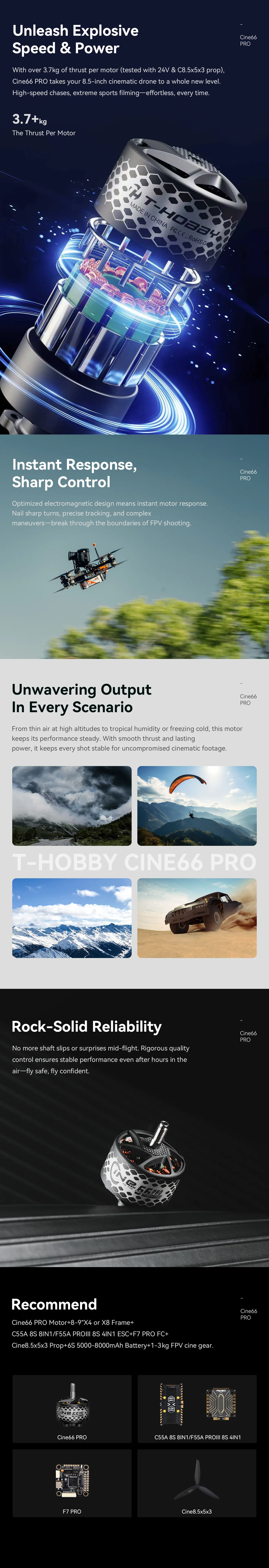 The T-HOBBY Cine66 PRO Motor is engineered specifically for cinematic FPV drones. Designed for 8-9-inch builds, this motor delivers explosive thrust, instant response, and reliable performance for professional aerial cinematography. Whether it’s high-speed chases, extreme sports, or stable long-range filming, the Cine66 PRO ensures every shot is smooth and cinematic.
