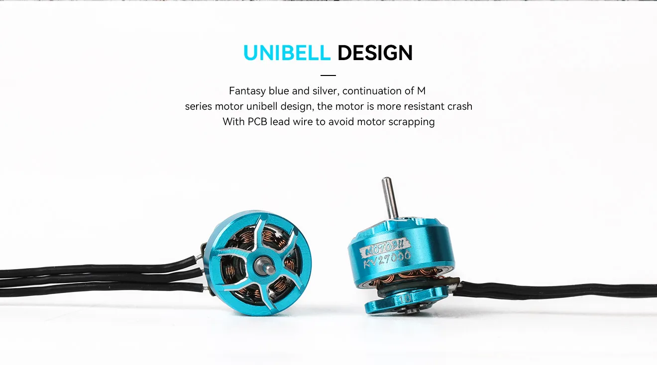 Featuring a fantasy blue and silver finish, this motor continues the signature unibell design of the M series, offering enhanced crash resistance. Equipped with a PCB lead wire to prevent damage and extend motor lifespan.
