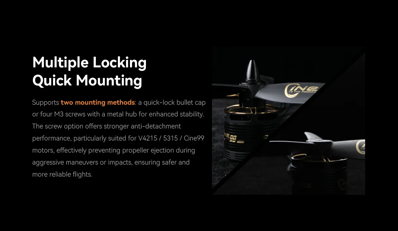 Supports quick-lock bullet cap or 4×M3 screws with metal hub, ensuring secure mounting and preventing prop ejection during aggressive maneuvers or impacts for safer, reliable flights.