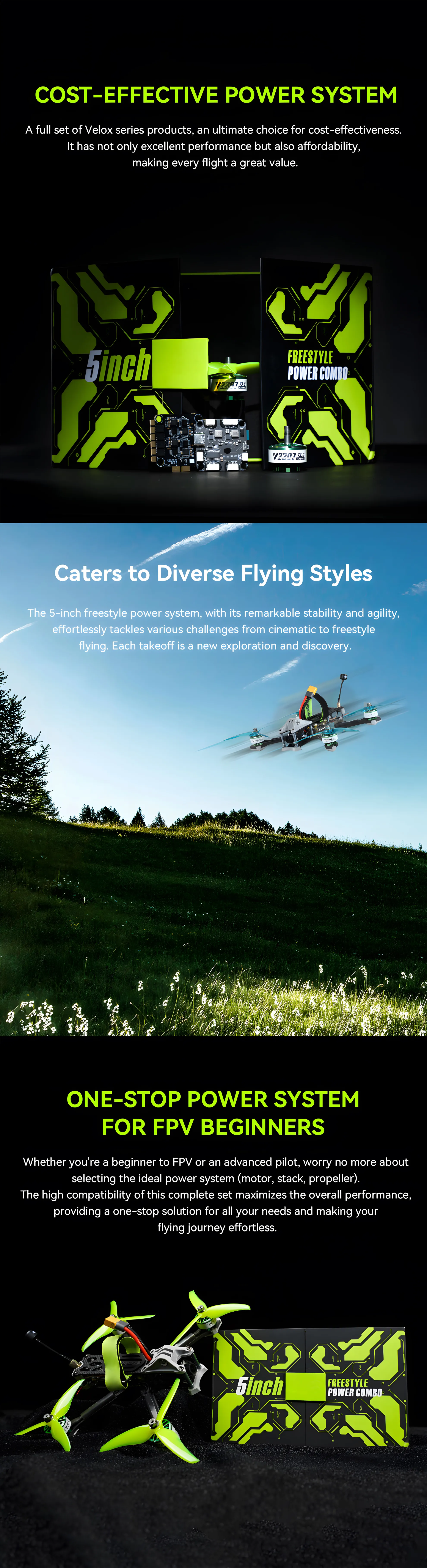 A: Yes. This system is designed as an all-in-one FPV power solution, making it beginner-friendly. You just need a suitable 5-inch frame, a compatible 6S battery, and a transmitter/receiver to get started with FPV racing or freestyle flying.