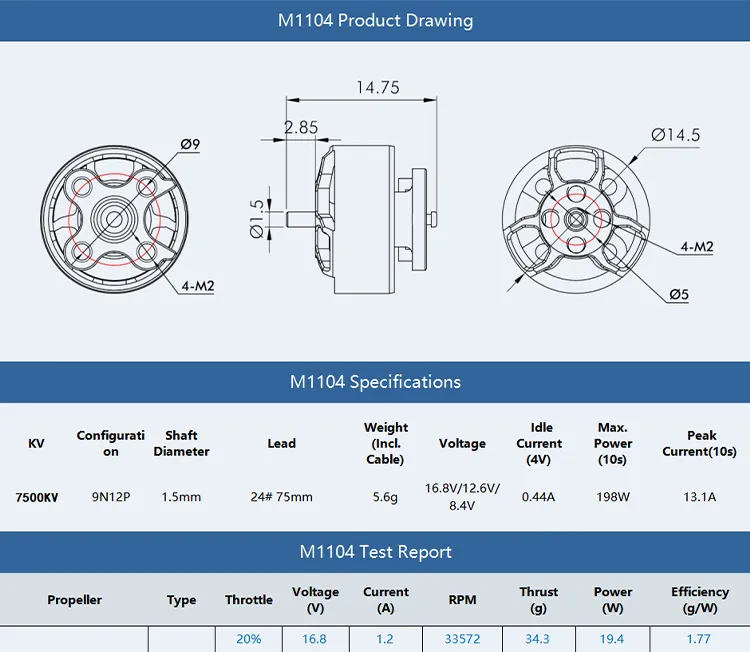 Weighing only 5.6g (including cable), the T-Hobby M1104 Micro Motor is ultra-light and highly agile, offering more flexibility and responsive flight for micro drones.